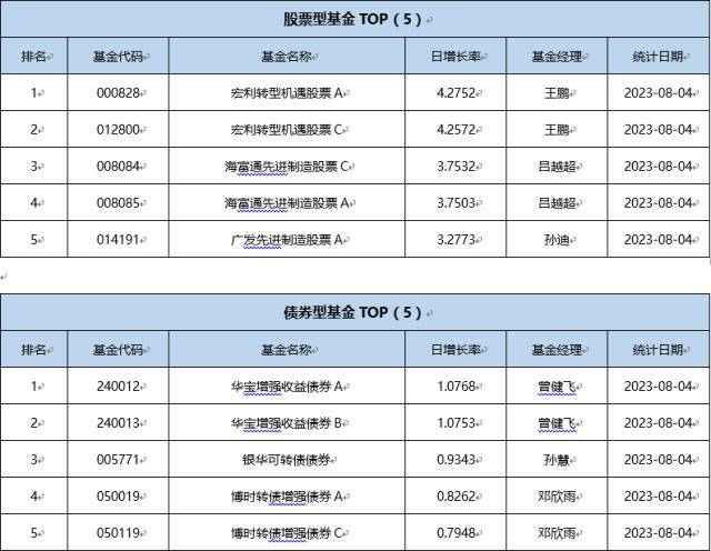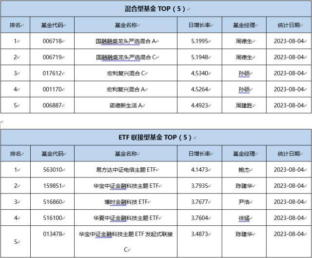 单基金方面,剔除掉 创新封基类型 基金的影响,8月4日业绩表现最好的基金为国融融盛龙头严选混合A,日增长率为5.1995 %,其次为国融融盛龙头严选混合C,日增长率为5.1948 %、鹏华创新未来混合(LOF),日增长率为4.5426 %。