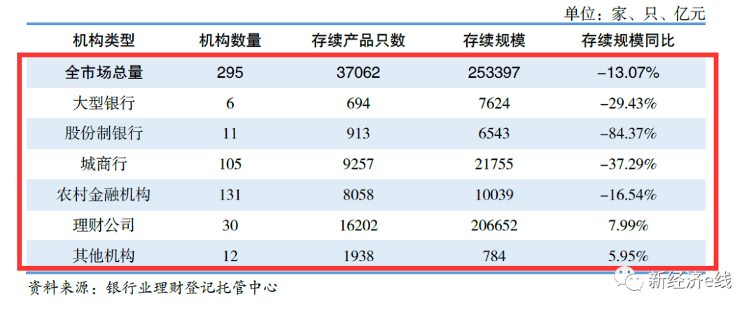 而在今年上半年存续规模大幅下降的各类机构中,股份制银行规模同比降幅居首,截至今年6月末,其存续产品数量为913只,存续规模已激降至6543亿元,同比大幅下降84.37%。紧随其后的为城商行,其存续产品数量和存续规模分别为9257只和21755亿元,规模同比降幅达37.29%。而大型银行的存续规模也大幅收缩至7624亿元,同比缩水29.43%。