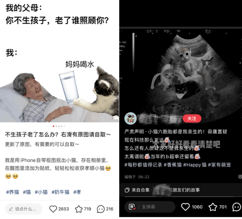 从社交平台的内容趋势来看,从云养宠到去年的“猫教/狗教”之争,再到今年的小猫出生文学、小猫养老文学,猫狗养宠话题长期霸榜,热度居高不下。