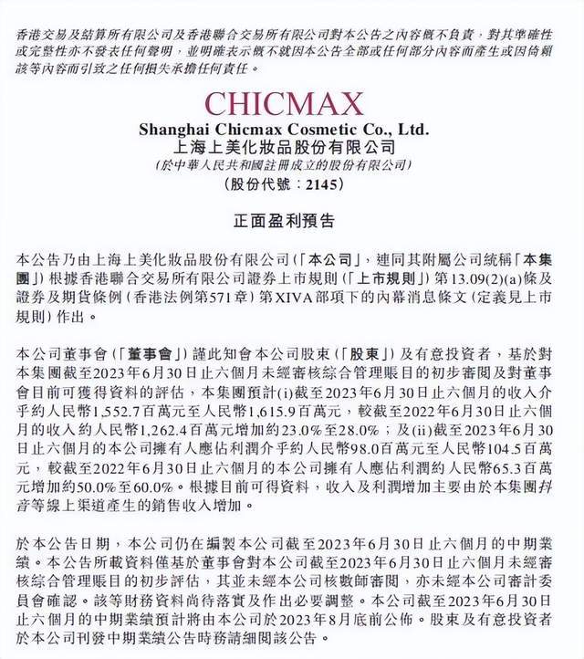 8月2日晚,港股上市公司上海上美化妆品股份有限公司(下称“上美股份”)发布了今年上半年盈利预告。根据未经审核综合管理账目的数据评估,上半年,上美股份营收约为15.527亿元至16.159亿元,同比增长23%至28%;利润约为0.98亿元至1.045亿元,同比增长50%至60%。