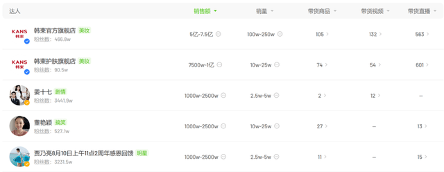 在达人合作上,飞瓜数据显示,上半年与韩束相关的带货视频高达7027个,带货达人高达4498位,覆盖了头部、肩部、腰部和潜力达人。除了韩束官方旗舰店和韩束护肤旗舰店之外,带货能力排名前三的分别是@姜十七、@董艳颖和@贾乃亮,三位达人的预估销售额均达到1000万-2500万。