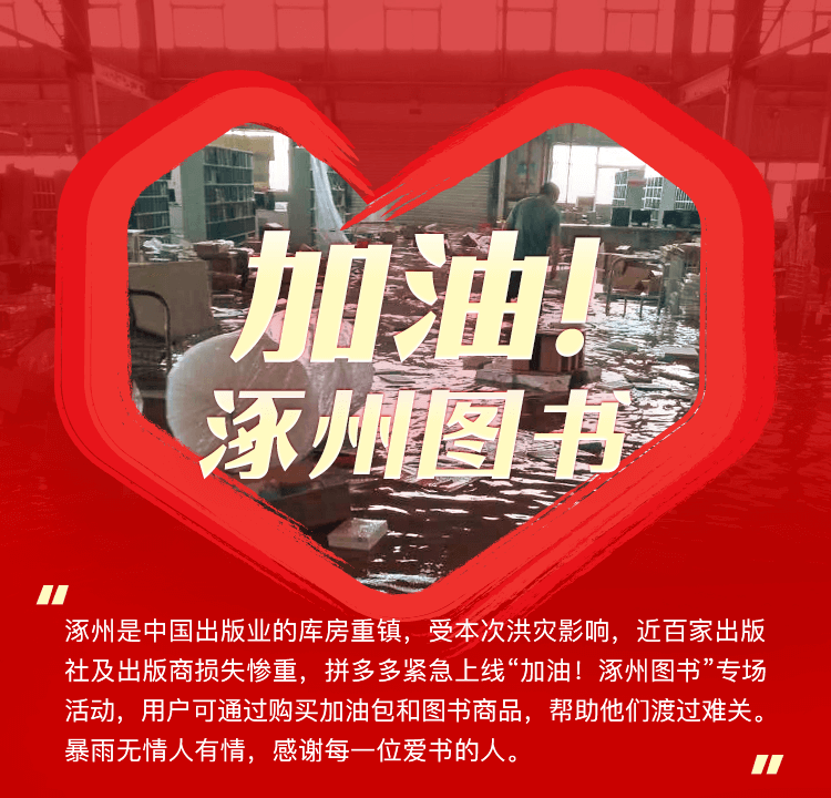 书籍是人类不可或缺的部分。拼多多与图书行业合作密切,“多多读书月”活动已举办五季,联合国内主流出版社、图书品牌,对优质、经典图书进行源头直补,累计补贴2000余万册精品好书。此次洪水重创涿州图书产业,拼多多将持续关注,与受灾书商携手共渡难关。