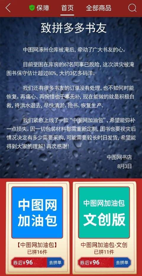 被洪水包围的第二天,拼多多针对部分受灾地区的发货时效作出调整,北京、河北多地店铺实施延迟发货政策,并由图书类目负责人对接中图网等受灾严重的出版机构,了解情况,协助开设店铺并提供帮助。