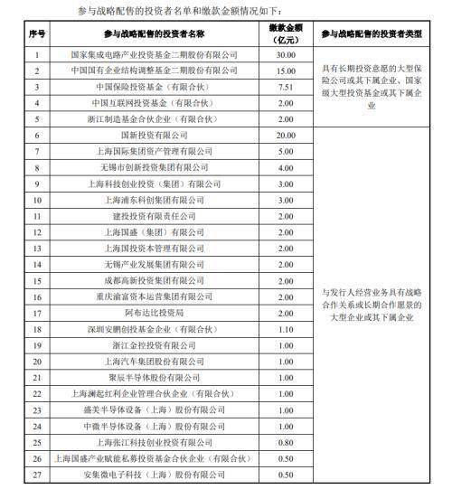 在此次上市前夕,华虹半导体披露了战略配售投资者,从名单看来,参与战投的机构共28家,其中既有国家级大型投资基金,也有半导体产业链厂商。