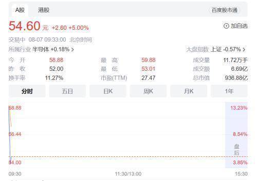 今日,华虹半导体登陆科创板,股价开盘大涨13%。截至发稿前每股为54.60元,涨幅达5%,总市值936.88亿。