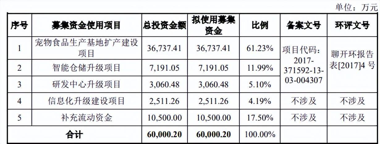 按照发行计划,乖宝宠物原募集资金6亿元,拟用于宠物食品生产基地扩产建设项目、智能仓储升级项目等。