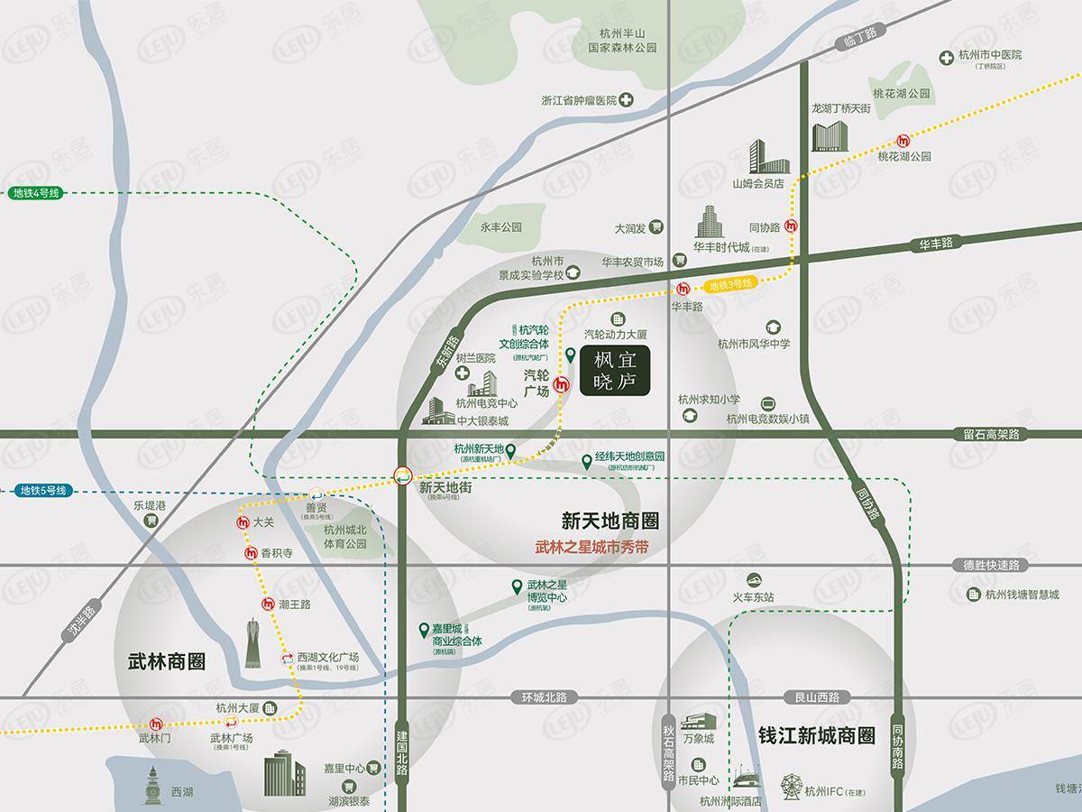 楼盘周边有项目地铁3号线汽轮广场站直线距离约300m,10站内可换乘1、2、4、5、19共5条地铁线,秋石高架、留石高架在侧,高效便捷,畅达全城。,周边商业有板块3公里范围内坐拥新天地购物中心(已开业)、银泰百货(已开业)、山姆超市(已开业)、华丰时代城(在建)、龙湖天街(已开业)等综合体,生活配套醇熟。