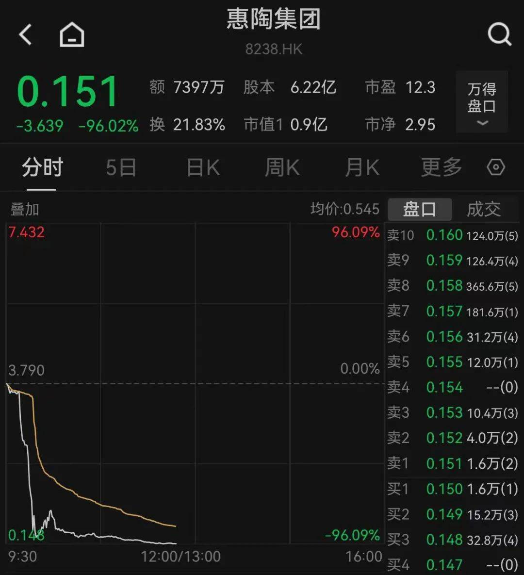 港股市场,多数股票波动不大,极个别股票大幅波动,其中今天上午又出现一只股价突然闪崩的股票,该股名为惠陶集团,其盘中跌幅一度近96%,此前该股在短时间内股价翻了10倍以上。
