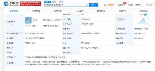 天眼查显示,8月3日,东莞棠雅实业投资有限公司成立。该公司注册资本15亿元人民币,注册地址位于广东东莞塘厦镇,公司法定代表人和董事长为王路。