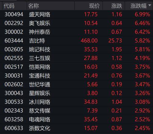 7日早盘,游戏股拉升,盛通股份涨停;盛天网络、姚记科技、奥飞娱乐、神州泰岳、吉比特、恺英网络、三七互娱领涨。