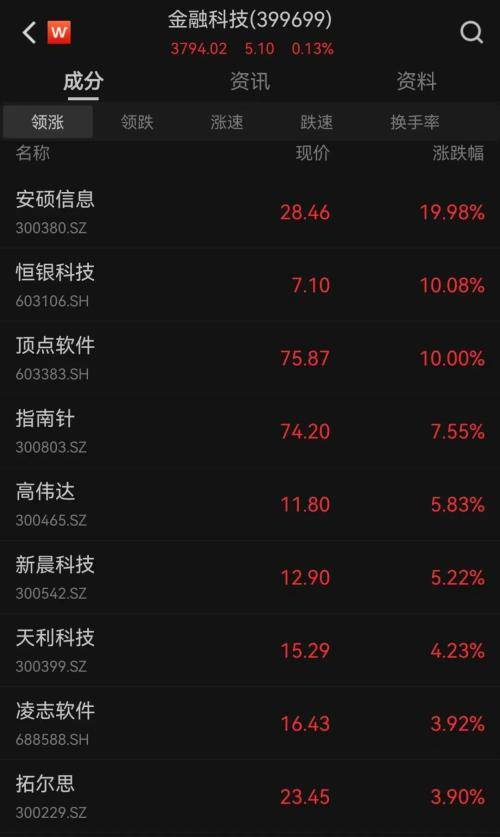 7日早盘,"牛市旗手"中券商概念股震荡分化,其中金融IT方向领涨,安硕信息20CM两连板,顶点软件三连板,首创证券、哈投股份涨停。