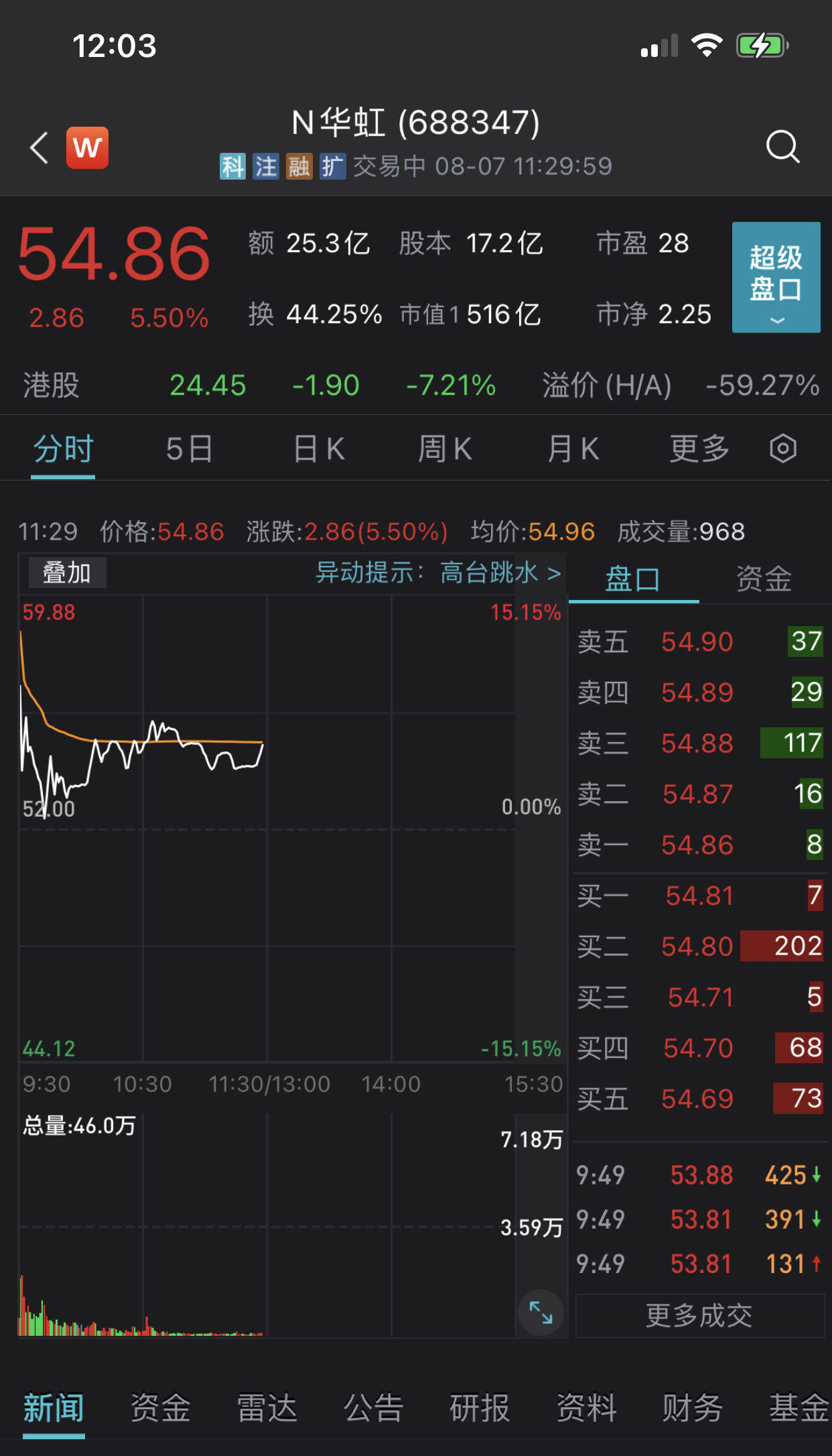 7日开盘,华虹半导体涨约0.2%,N华虹涨超13%。截至午间收盘,华虹半导体跌7.21%,每股24.45港元;N华虹涨5.50%,每股54.86元。Wind显示,截至8月7日,N华虹拥有股东约12.44万户。