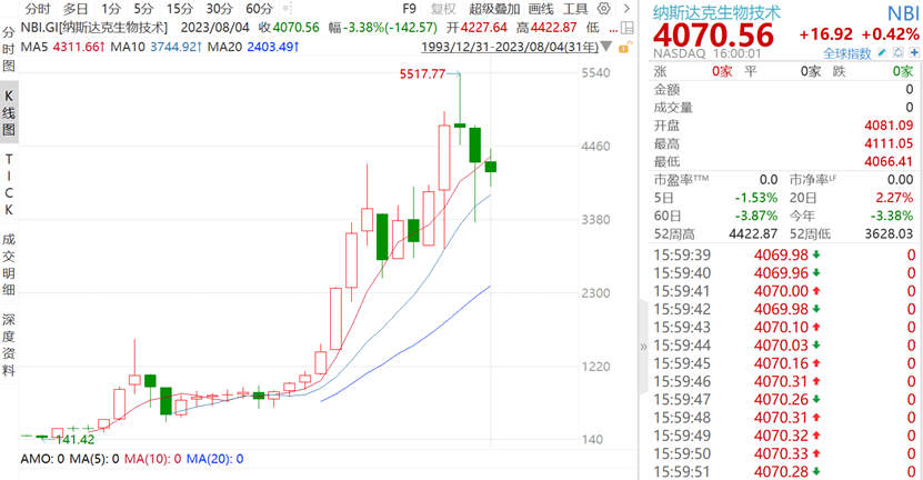 从估值上看,截至8月3日,纳指生物科技板块最新PE已回调至15.74倍。