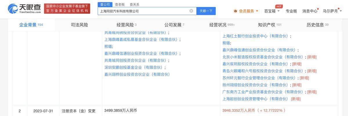 天眼查App显示,近日,上海同驭汽车科技有限公司发生工商变更,股东新增小米旗下北京小米智造股权投资基金合伙企业(有限合伙)、建设银行旗下嘉兴宸玥股权投资合伙企业(有限合伙)等,公司注册资本由约3499.39万人民币增至约3946.34万人民币,增幅约12.77%。