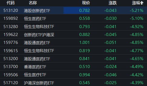 下跌方面,港股创新药类ETF大跌,跌幅为5.21%。