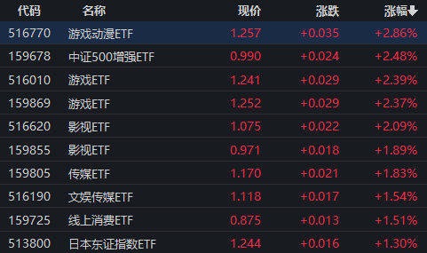 ETF方面,游戏、影视类ETF领涨全市场,最高涨幅为2.86%。