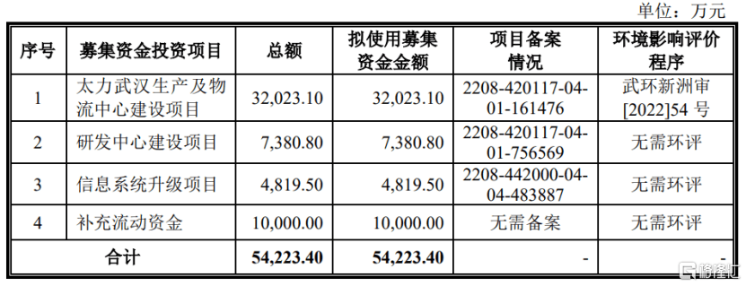 本次冲刺IPO,公司拟募资5.42亿元,将用于投入“太力武汉生产及物流中心建设项目”、“研发中心建设项目”、“信息系统升级项目”、“补充流动资金”。