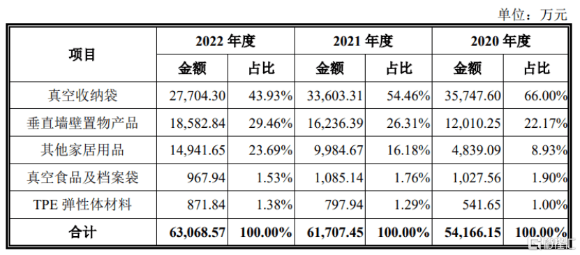 分产品来看,真空收纳袋和垂直墙壁置物产品是公司的主要收入来源,其中核心产品真空收纳袋收入金额由2020年的3.57亿元降至2022年的2.77亿,占比由66%降至43.93%。