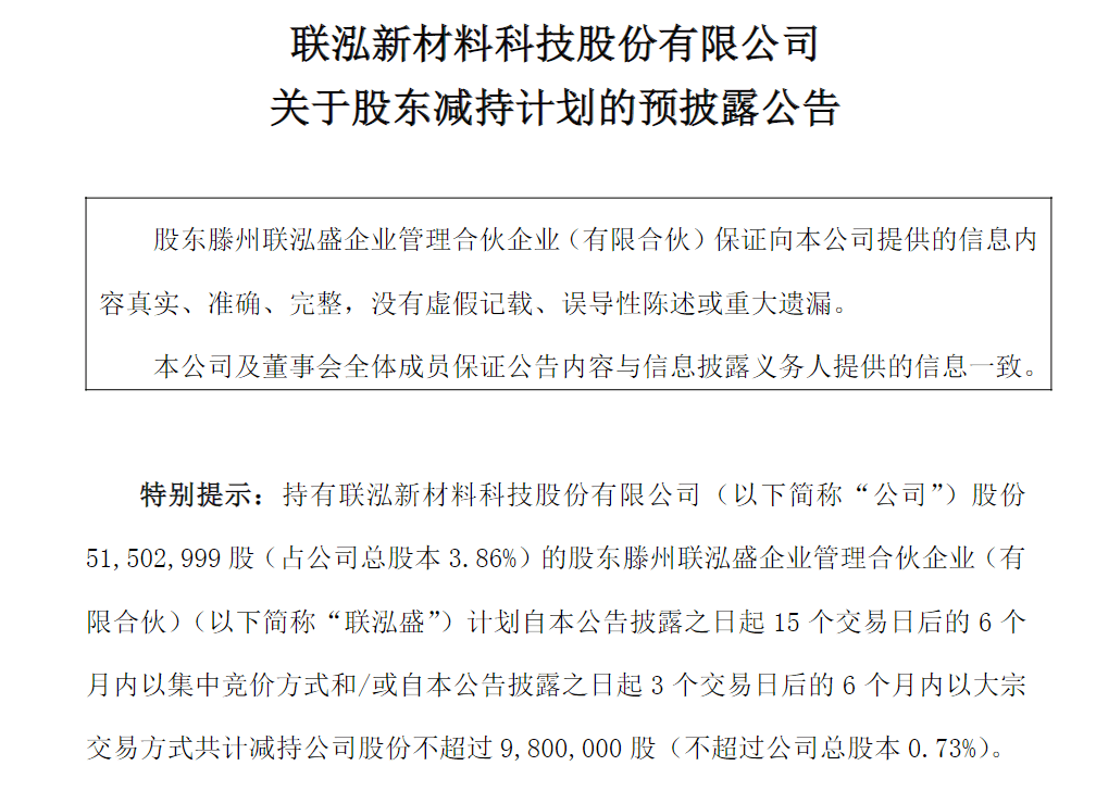 公告显示,联泓盛当前持有约5150.3万股股票(占公司总股本3.86%),计划6个月内以集中竞价方式或大宗交易方式共计减持公司股份不超过980万股(不超过公司总股本0.73%)。减持原因显示为个人资金需求。