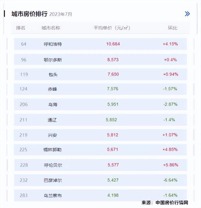 1、呼和浩特,7月平均单价为10684元/平方米,环比涨幅为4.15%,居全国第64位。