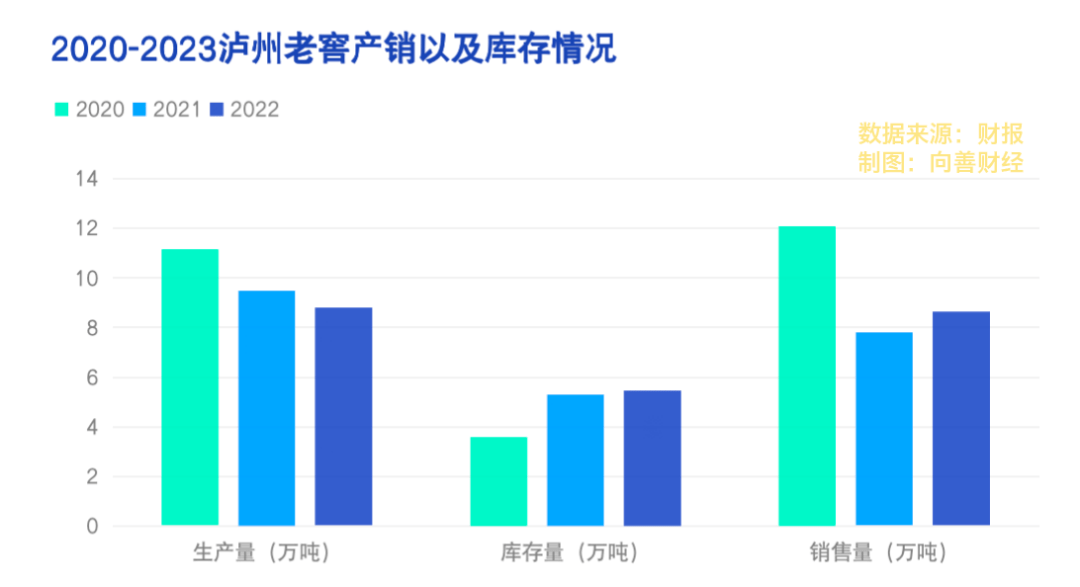 从产销的情况来看,从2020年到2022年,泸州老窖的生产量从11.14万吨逐步减少到8.79万吨,而库存量从3.59万吨增长到了5.46万吨。销售量方面,从12.09万吨下降到8.62万吨。