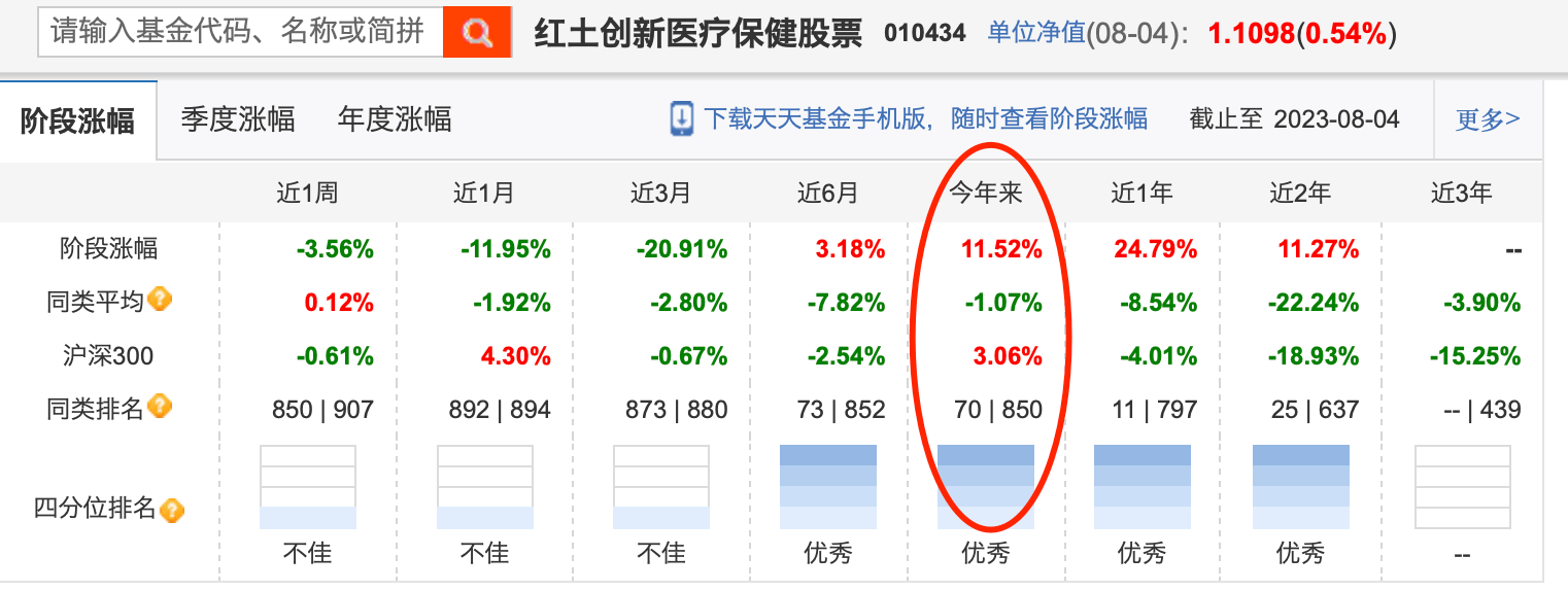 当然,并不是所有的医药基金都是如此惨淡。部分医药基金今年不但没有大幅亏损,反而逆势飘红。其中比较典型的就是红土创新医疗保健股票,该产品今年以来盈利超过11.52%,在股票型基金中位居前10%的位置。