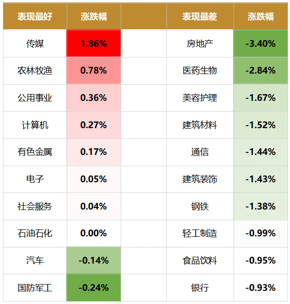 盘面上,31个申万一级行业中有8个行业上涨,其中传媒,农林牧渔,公用事业行业领涨,涨幅分别为1.86%,0.78%,0.36%。房地产,医药生物,美容护理行业领跌,跌幅分别为3.40%,2.84%,1.67%。