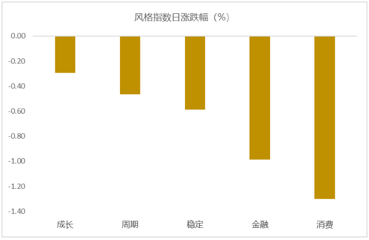 从风格指数上来看,今日所有风格表现不佳,其中成长和周期风格的个股跌幅最小,金融和消费风格的个股表现最弱。近期风格转换较为明显。