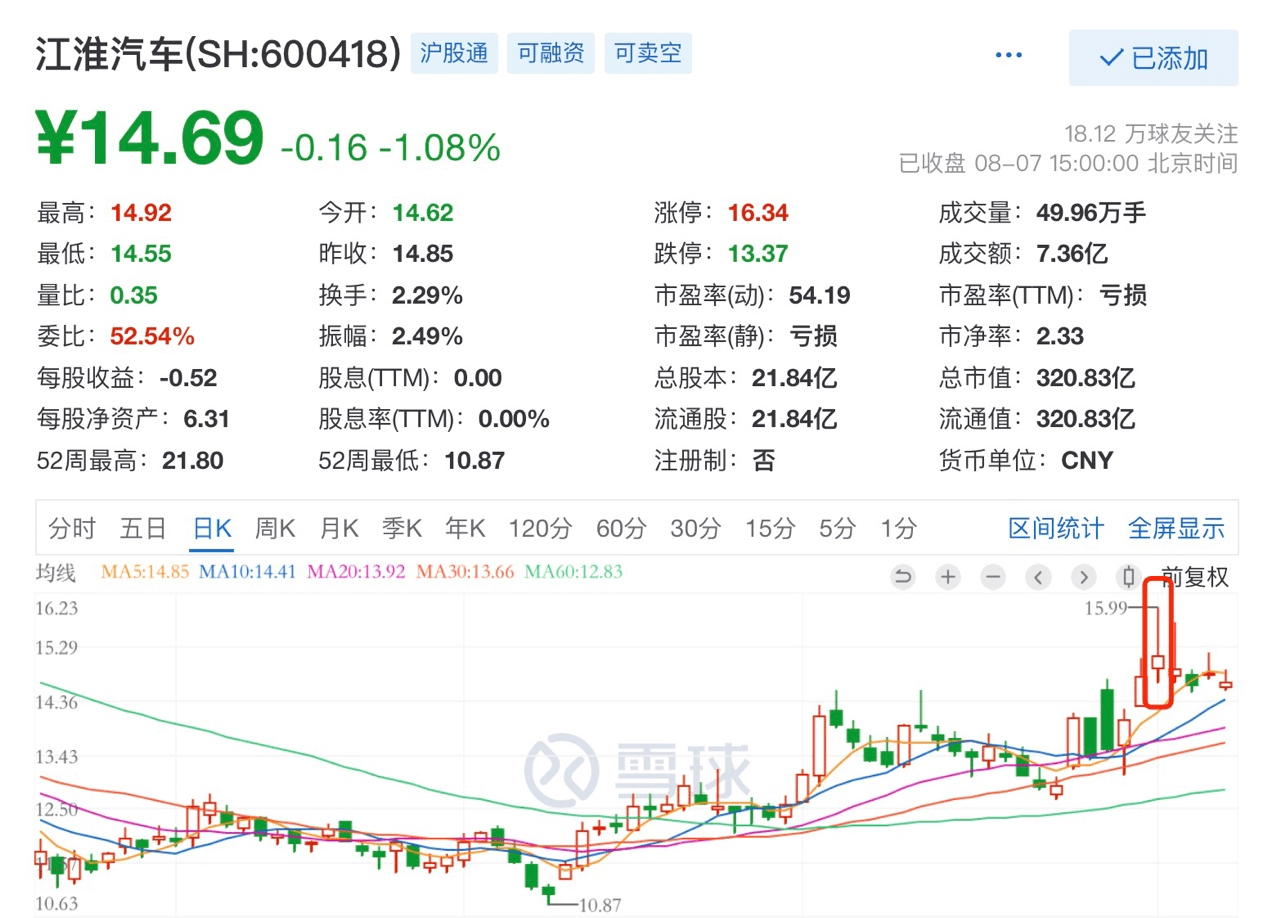 受这一消息刺激,8月1日,江淮汽车股价一度飙涨超8%,最终收于15.14元,上涨2.37%。