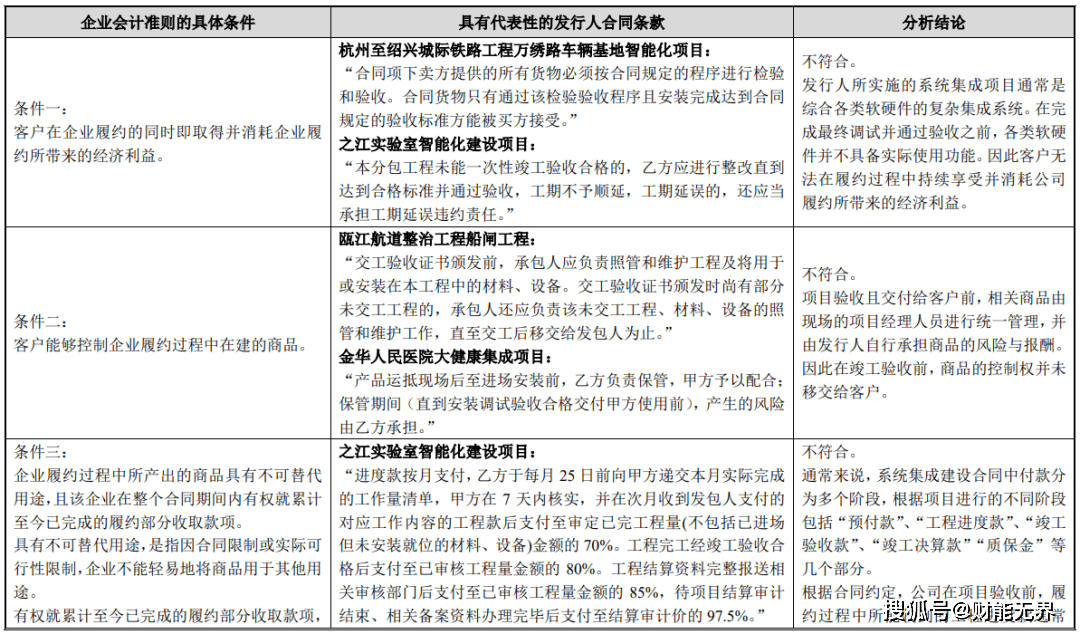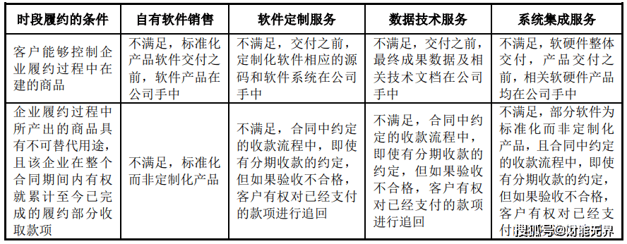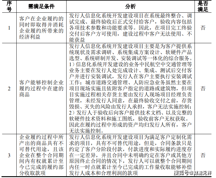 根据新收入准则第十一条规定:满足下列条件之一的,属于在某一时段内履行履约义务,否则属于在某一时点履行履约义务。发行人信息化系统开发建设项目与新收入准则规定具体对比分析如下:
