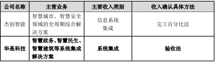 可比公司杰创智能、海峡创新采用“完工百分比法”,银江技术对其弱电系统项目、智能建筑工程采用“完工百分比法”。海峡创新及银江技术由于上市时间较早,未详细披露其采用“完工百分比法”的具体原因或相关合同条款,此处根据杰创智能公开披露资料,对其收入确认方法的相关内容进行对比如下: