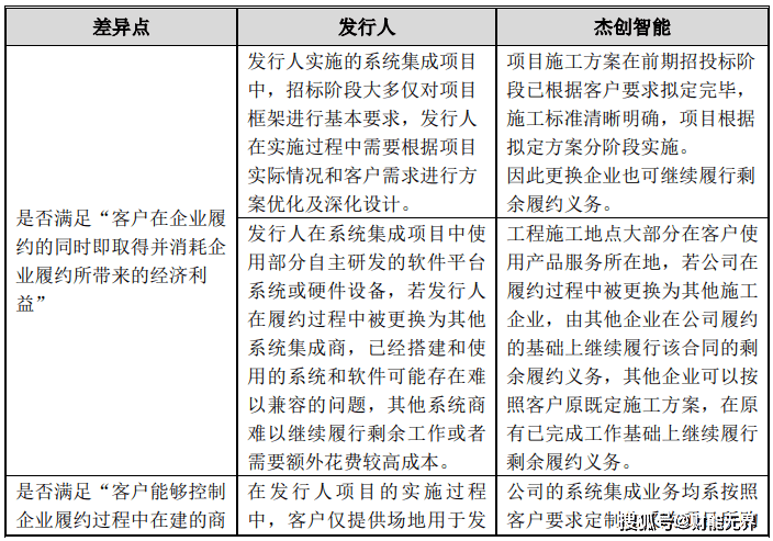 综上所述,由于发行人和杰创智能在项目具体施工内容、存货管理方式和付款进度等方面存在差异,发行人根据自身项目情况及合同条款,采用了与杰创智能不同的“验收法”作为系统集成项目的收入确认方式,符合企业会计准则的要求和公司实际情况,具备合理性。