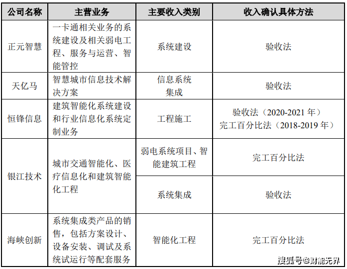 在上述6家可比公司中,正元智慧、天亿马、恒锋信息均采用验收法作为收入确认方法,其中,恒锋信息自2020年度开始,从“完工百分比法”调整为“验收法”进行收入确认;海峡创新、杰创智能采用“完工百分比法”作为收入确认方法;银江技术同时采用了“验收法”及“完工百分比法”,总体上看,系统集成行业中的不同企业根据自身情况选择采用不同的收入确认方法。发行人根据企业会计准则的要求,结合自身实际情况,采用“验收法”确认收入,符合同行业情况。