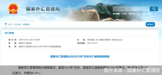 北京商报讯(记者 刘四红)新一期外汇储备数据出炉。8月7日,国家外汇管理局统计数据显示,截至2023年7月末,我国外汇储备规模为32043亿美元,较6月末上升113亿美元,升幅为0.35%。