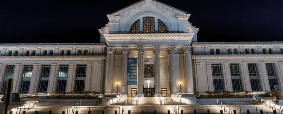 在美国自然历史博物馆的外侧,灯光向下照亮栏杆和道路,而不是向上射入天空,以减少光污染。(图/smithsonianmag)