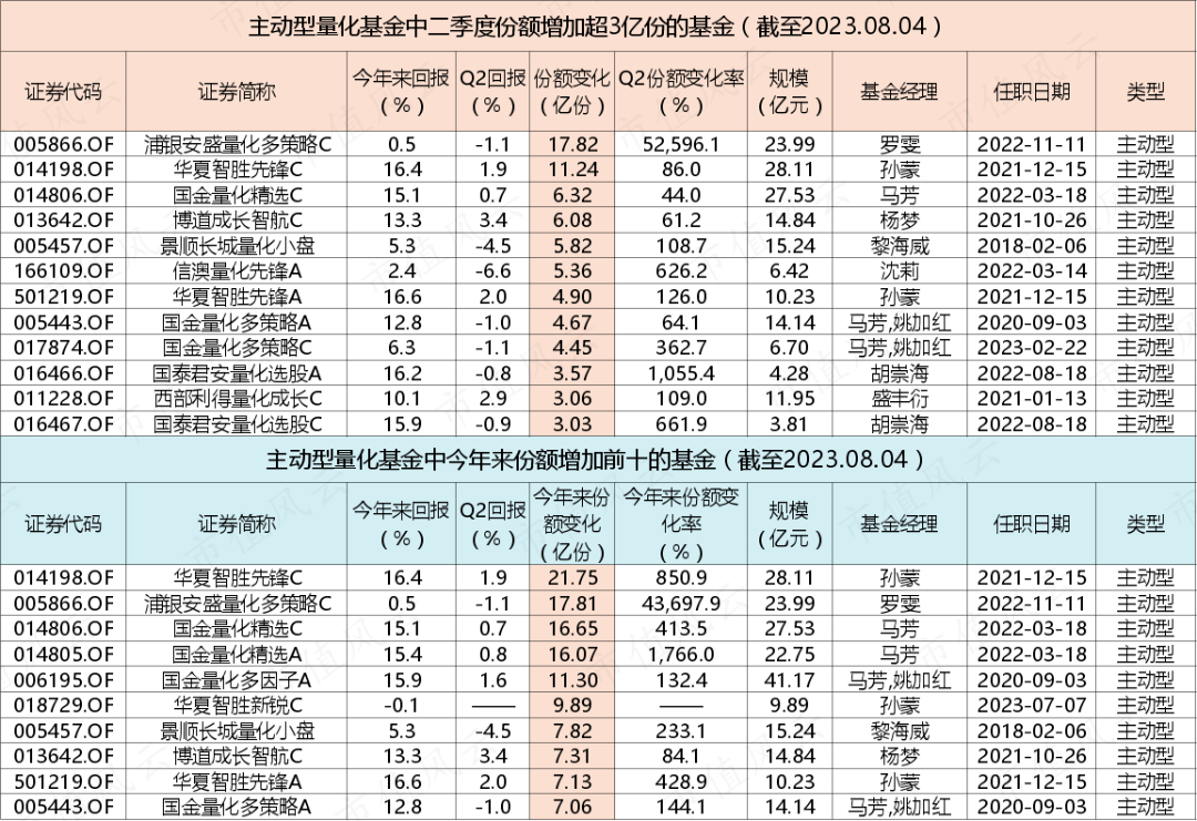 今年来份额增长居前的还有马芳管理的国金量化精选A/C,国金量化多因子A等,份额均有11亿份以上的增长。