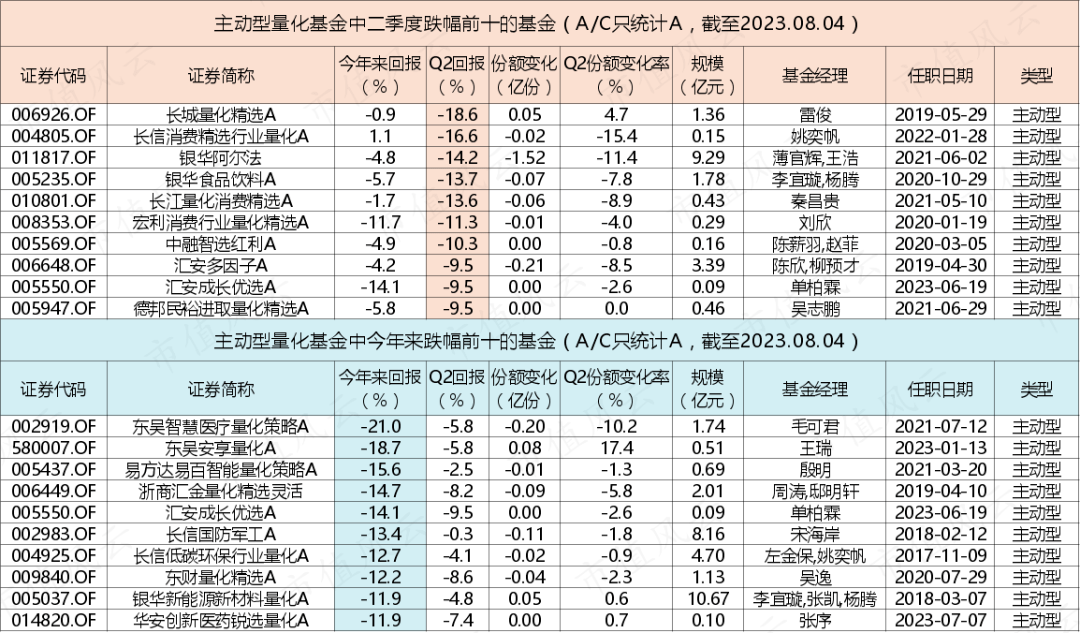 与主动权益型基金类似,二季度主动量化基金中也有近8成亏损,平均亏损2.7%,跌幅最大的是长城量化精选A(006926.OF),期间亏损近19%,而今年来亏损最大的是东吴智慧医疗量化策略,亏损幅度达21%,该基金主要投资智慧医疗主题相关股票。