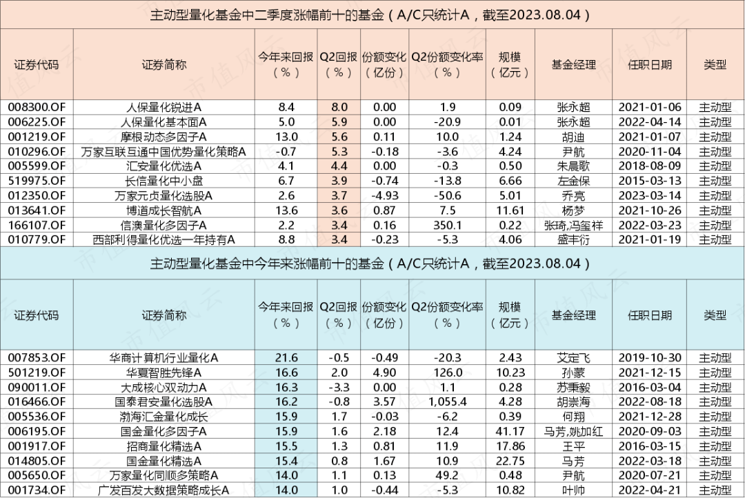 反观涨幅榜单中,二季度表现最好的是张永超管理的两只基金——人保量化锐进A(8%)、人保量化基本面A(6%),而今年来表现最好的是华商计算机行业量化A(22%),从名称也可以看出,这只基金重点投资于计算机行业上市公司,是今年的风口行业。