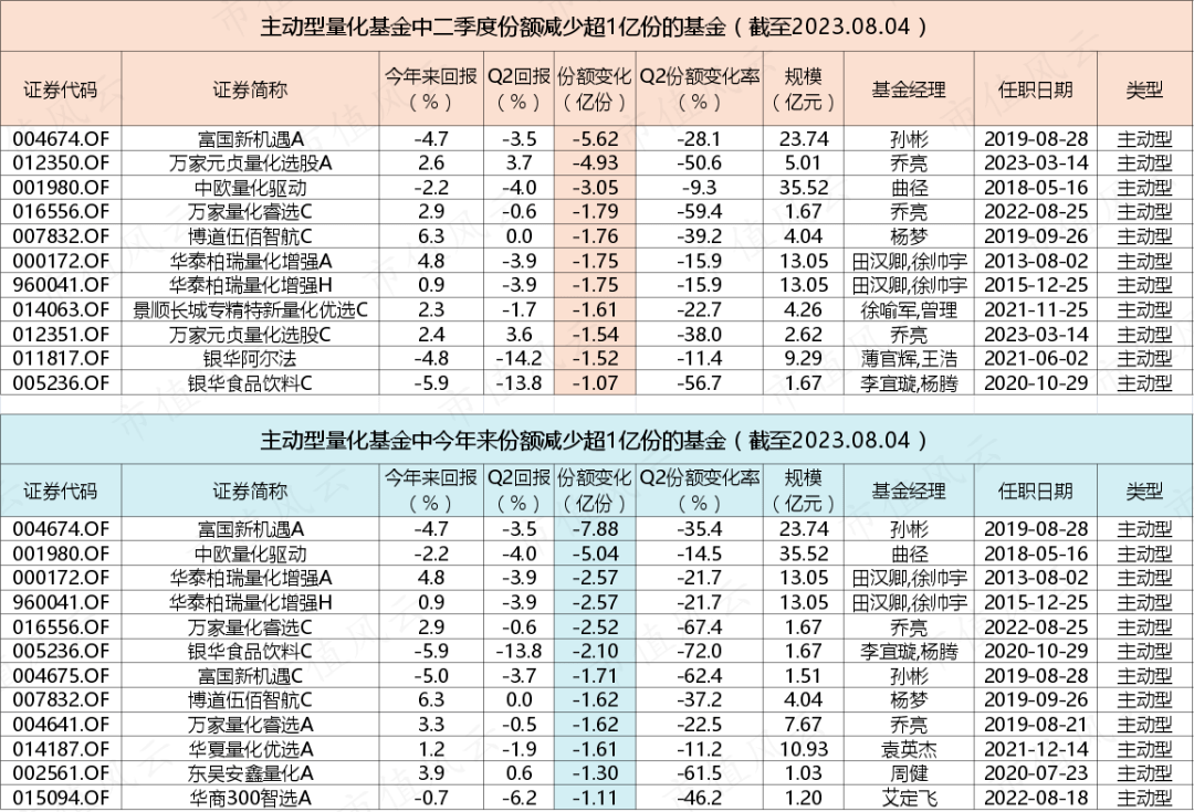 二季度份额减少最多的是富国新机遇A,减少5.6亿份,这也是今年来份额减少最多的主动型量化基金。