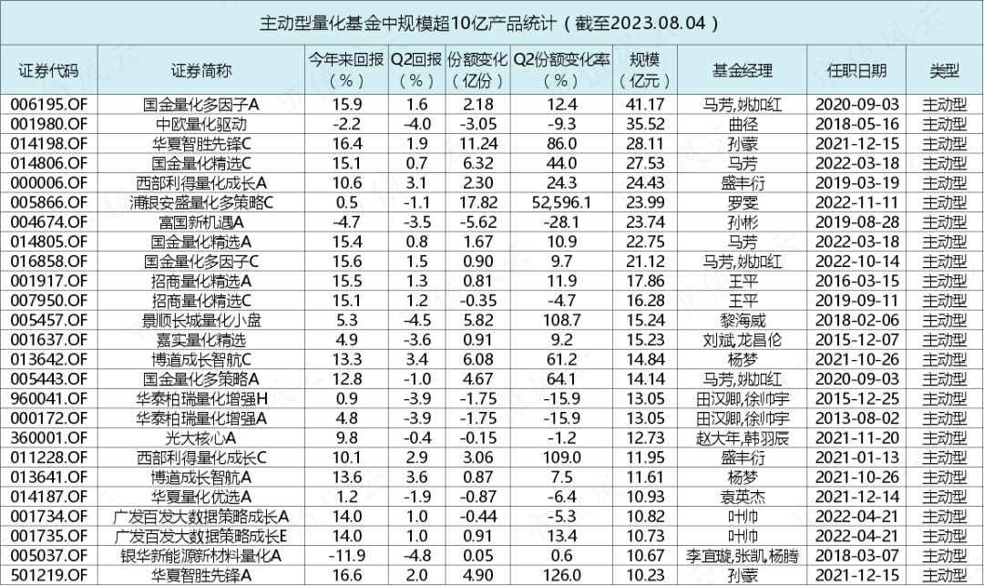 规模25亿以上的还有曲径的中欧量化驱动(35.5亿)、孙蒙的华夏智胜先锋C(28.1亿)以及马芳单独管理的国金量化精选C(27.5亿)。