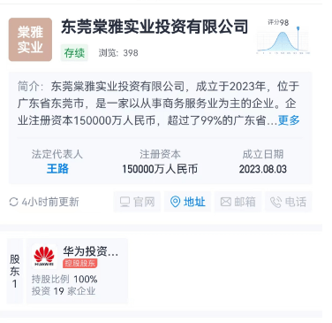 8月7日,据天眼查显示, 8月3日,华为投资控股有限公司新成立东莞棠雅实业投资有限公司(以下简称“东莞棠雅实业”),注册资本 15 亿元人民币。法定代表人为王路,经营范围包含一般项目:住房租赁;非居住房地产租赁;园区管理服务;工程管理服务。许可项目:房地产开发经营。这与此前腾讯的操作,如出一撤。