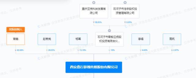 目前,杨幂仅在西安嘉行影视传媒股份有限公司持有股份。天眼查App显示,嘉行传媒注册资本为2000万人民币,曾嘉为法定代表人、董事长兼总经理。2022年年报显示,曾嘉、赵若尧分别持股约45.56%、20.25%,为前两大股东,杨幂持股约15.19%,为第三大股东。