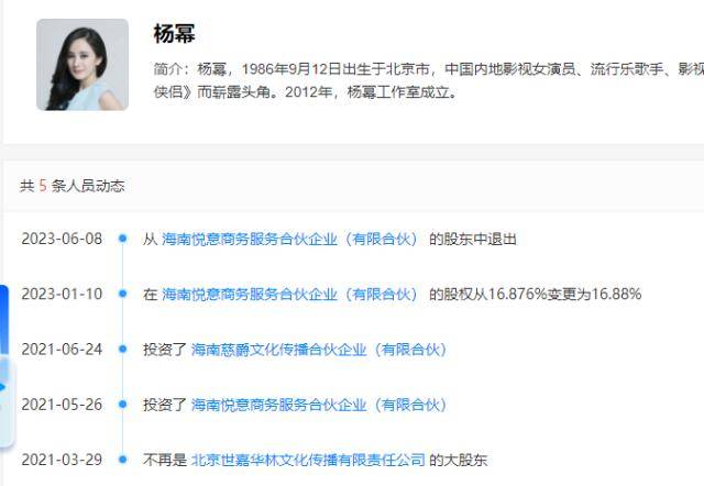 近日,杨幂再退出一家与嘉行传媒老板合开的公司,退出前杨幂持有该公司25%股份。