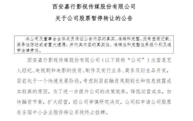 2018年起,监管部门不再准入明星资本化影视公司,同时对上市相关企业展开调查。同年5月,嘉行传媒中止了新三板挂牌,公司称:“考虑到目前融资周期较长和信息披露成本较高的原因,为了进一步提升公司的决策效率,降低运营成本,加快融资节奏,扩大经营,经公司审慎研究决定,公司拟申请公司股票在全国中小企业股份转让系统终止挂牌。”