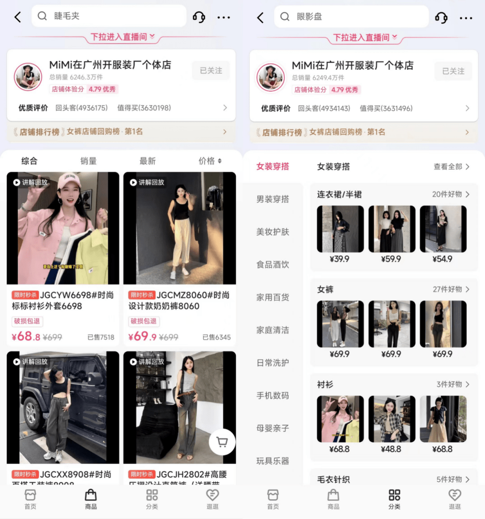 “MiMi在广州开服装厂”便持续丰富店铺商品,同时将直播间爆款产品在店铺内长挂并设置直播间同等价位,匹配直播的产品讲解回放,承接用户复购需求,积累销量,店铺单月GMV超1200万。