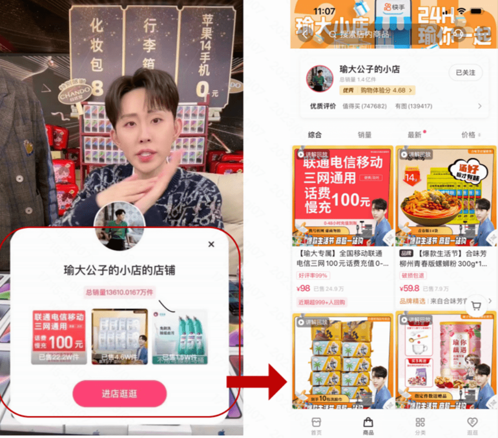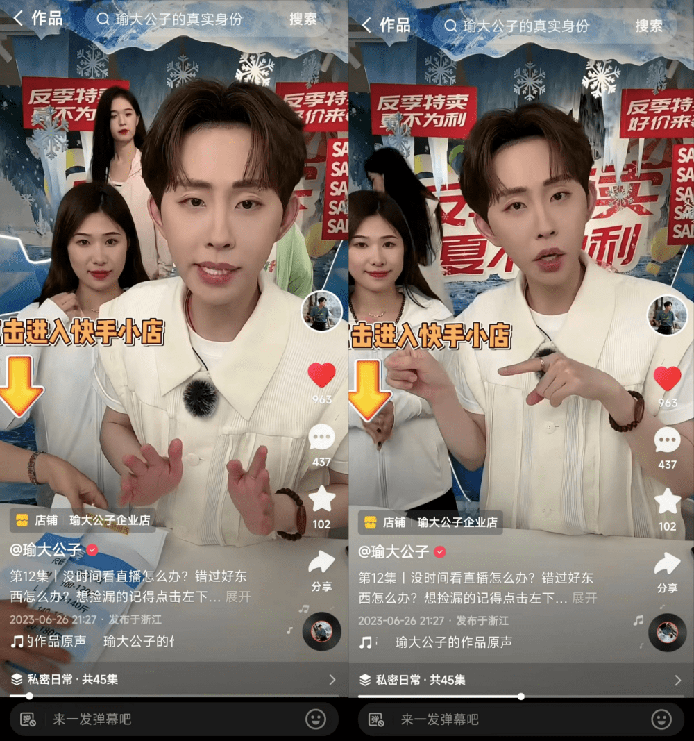 快手达人“瑜大公子”在店铺装修及精选货品供给的基础上,利用挂店短视频为店铺引流,同时下播前推送进店弹窗,配合主播口播讲解店铺内的直播同价产品及店铺营销玩法,实现店铺流量提升超20%,单日店铺页GMV超130万,店铺访购率超10%。