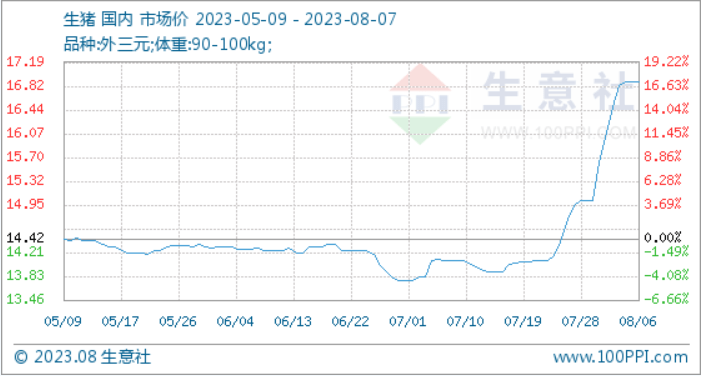 生意社分析报告显示,7月猪价在月内跌入14元/公斤关口后,冷冻肉收储工作启动,养殖户惜售挺价心态趋强,加之台风天气带来大量降雨,高温多雨在一定程度上影响了生猪外运,生猪市场供应整体偏紧,7月底猪价大幅回升。进入8月,高温多雨天气使得生猪运输受阻、加之养殖户惜售挺价心态不减、以及冷冻肉政策面加持,国内生猪市场价格继续偏强运行,8月4日猪价上涨至16.88元/公斤,较上半年低点6月30日(13.77元/公斤)大幅上涨22.59%,五周内猪价涨幅抹平上半年全年跌幅。