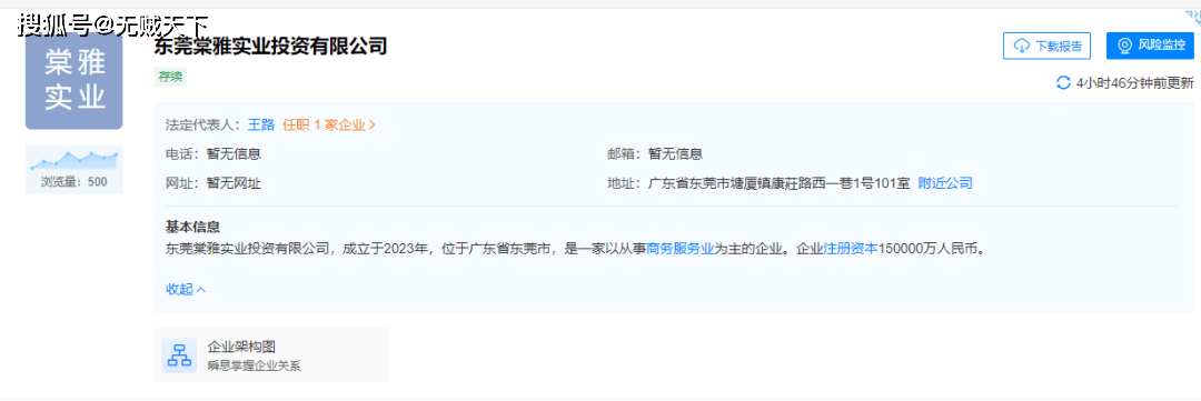 企查查、天眼查等App显示,8月3日,东莞棠雅实业投资有限公司成立,注册资本15亿人民币,法定代表人为王路,经营范围包含住房租赁、非居住房地产租赁、园区管理服务、工程管理服务、房地产开发经营。