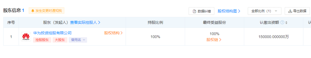 股东信息显示,该公司由华为投资控股有限公司100%全资持股。