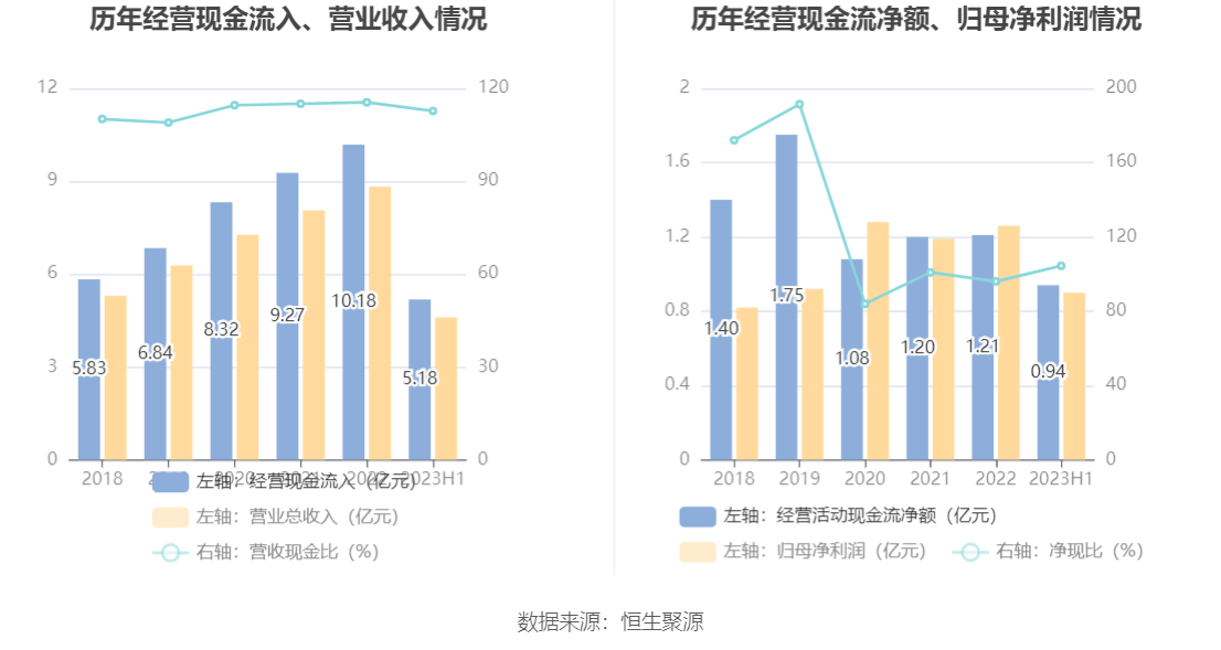 2023年上半年,公司营业收入现金比为112.69%,净现比为104.46%。